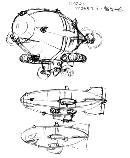 公海警備隊の飛行船のデザイン。 途中から大破した船から新型に乗り換える予定でした。ちなみに一番下のが主人公達が乗ってる「1208号」です。