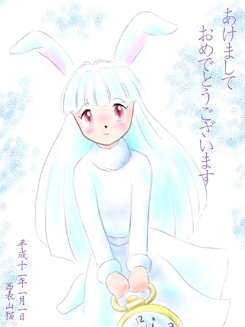 西表山猫 さん(幻想図書館)からの年賀CGです。 どうも有り難う _(._.)_。 とっても可愛いしろうさぎちゃんです (^.^)。 でも、あんまり見とれて時間を忘れないでね (^_^;)/