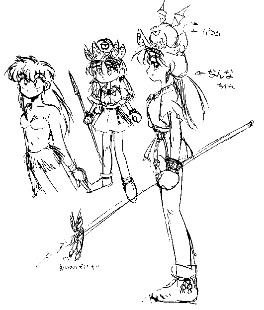 現在制作中の漫画のキャラクターです。 ・・・が、どこの本に載るかは未定、としておきましょう(^_^;)> ところで・・・何でか知らんが左にいるのはデビュー作に出たキッカちゃんなんだが どうしてこんな所にいるのやら・・・ (^_^;)>