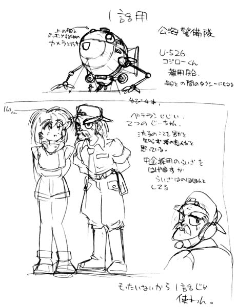 順主人公のテッちゃんのじいちゃん。 本編では第3話で高性能WIG(地面効果機)に乗っているが最初は第1話でコジローくん に乗る予定だった。 第1話の最初のコマに登場するのがそれで、上のデザインよりうんと可愛くしてあります。 このコジローくん、女の子に人気があったらしい。・・・が、アンケート結果と言う物は月刊誌 の場合掲載から2〜3ヶ月後に判明する物なので作品に反映する事は出来ませんでした。